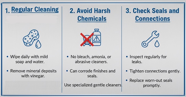 - Check Seals and Connections: Periodically inspect caulking and faucet fittings to ensure they remain tight and watertight. Early detection of loose seals prevents leaks and water damage.